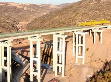 施工團隊在施工現場架設了兩臺大型龍門吊,配備上吊重用的電動葫蘆,在起重葫蘆的牽引起重下,一片片大噸位梁板被吊裝到高處,并順利安裝到位。